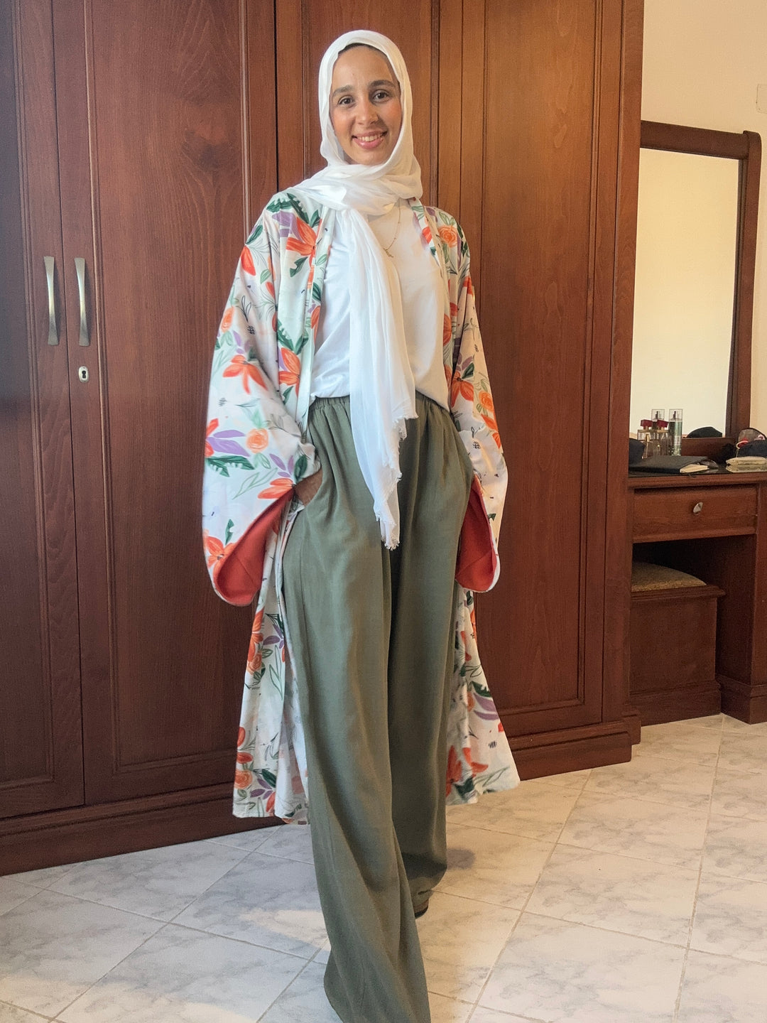 Printted olive linen kimono