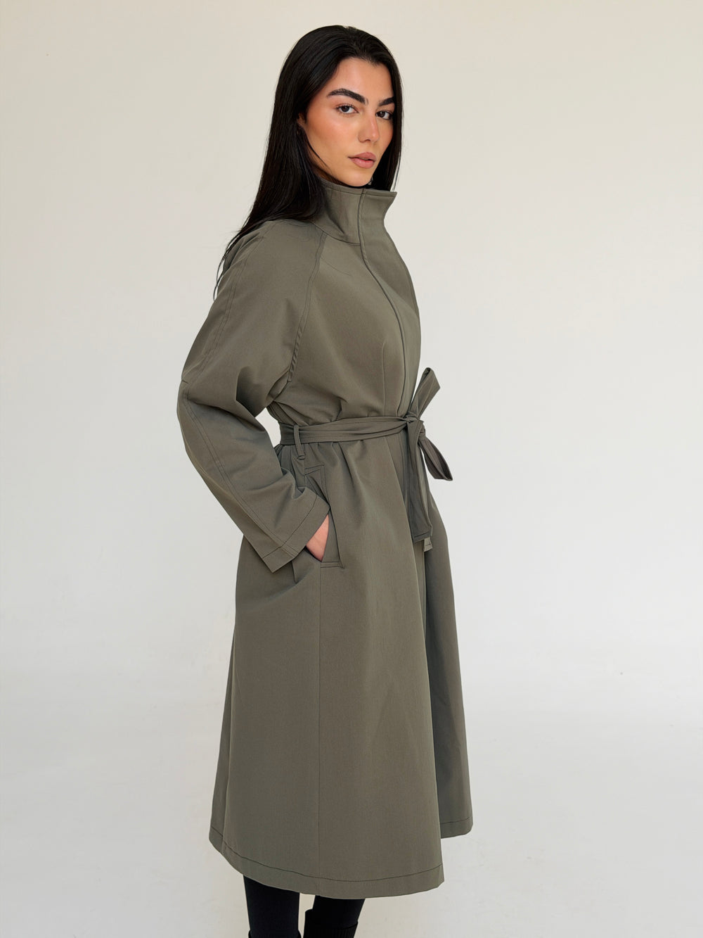 Gabardine long trench coat- dusty green